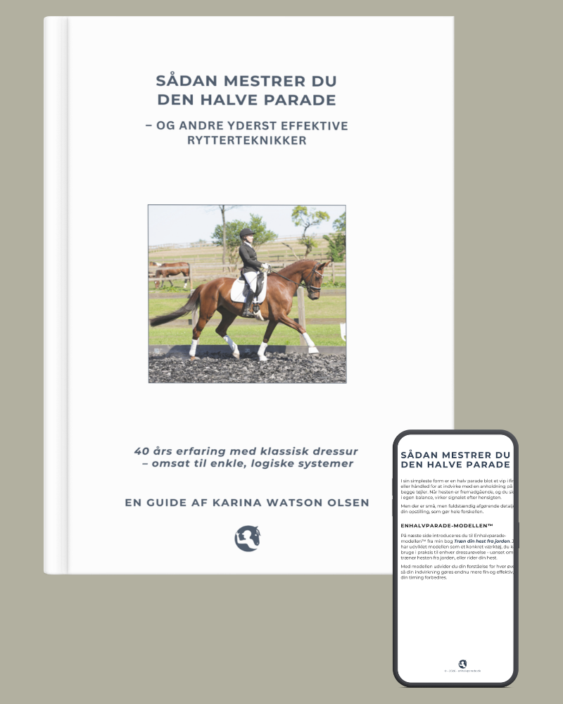 Mærk hvordan Enhalvparade-modellen™ fremmer takt, løsgjorthed, accept af biddet, spændstighed, ligeudretning og samlingsgrad.